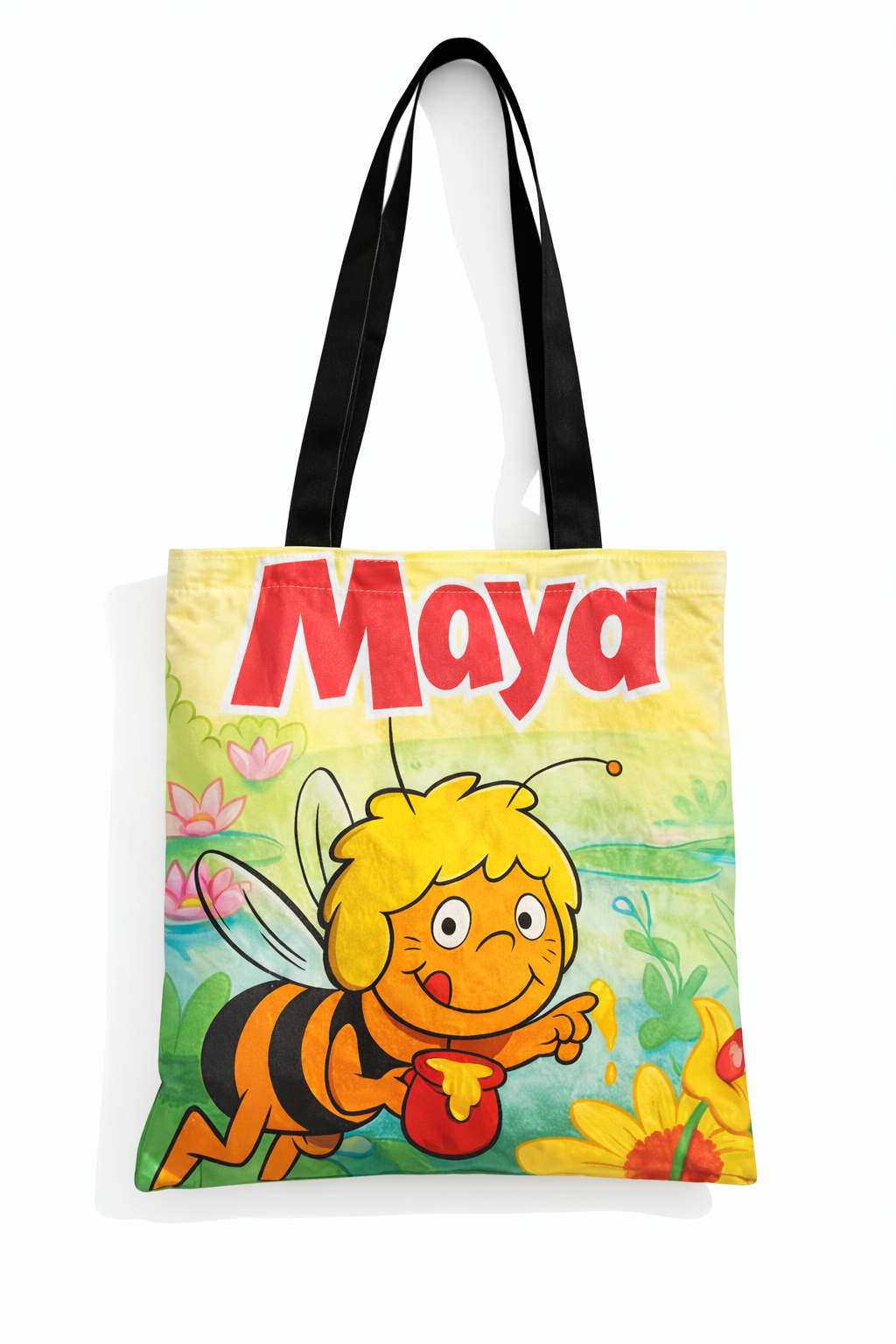 Il vivace design con Maya e i fiori la rende un accessorio pratico e allo stesso tempo divertente, ideale come shopper quotidiana, borsa per il tempo libero o simpatica idea regalo.