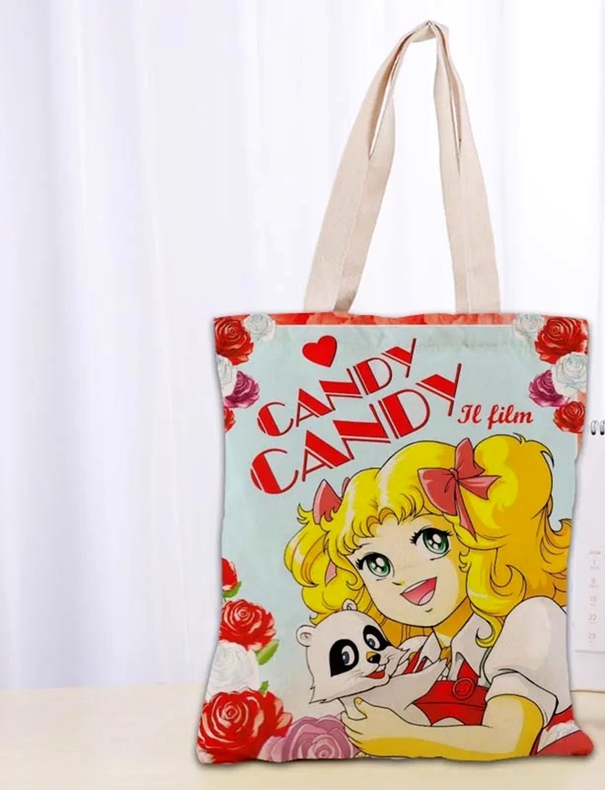 Dolcissima borsa a tracolla ispirata alla mitica Candy Candy, perfetta per chi ama gli anime e i cartoni vintage. La stampa è coloratissima, con Candy e un tenero animaletto, decorata con rose e la scritta “Candy Candy”, per un look romantico e nostalgico.