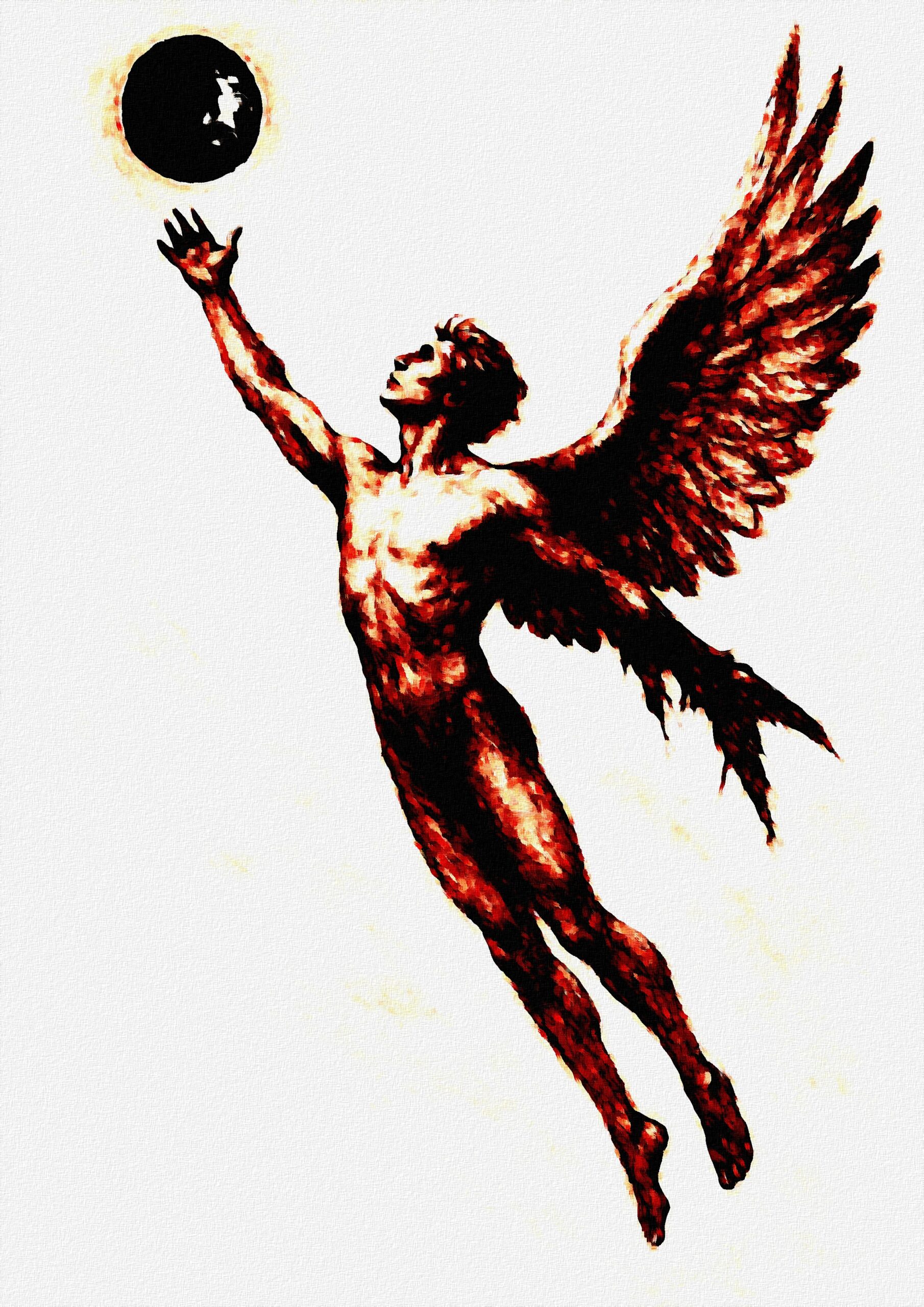 L’opera diventa così una riflessione sul limite e sulla sete di conoscenza, sulla bellezza e il rischio dell’elevazione. La sfera nera, simbolo della verità nascosta, ci ricorda che anche la luce più pura nasce dal confronto con l’ombra.