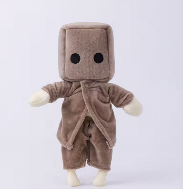 Il personaggio è riconoscibile grazie alla caratteristica scatola quadrata sulla testa, qui riprodotta in peluche imbottito con due occhi tondi in applicazione nera. L’abbigliamento, composto da cappotto e pantaloni marrone-beige, è realizzato in morbido tessuto coordinato e cucito con cura per mantenere la forma. Le mani e i piedi chiari aggiungono contrasto e completano l’aspetto semplice ma iconico del personaggio.